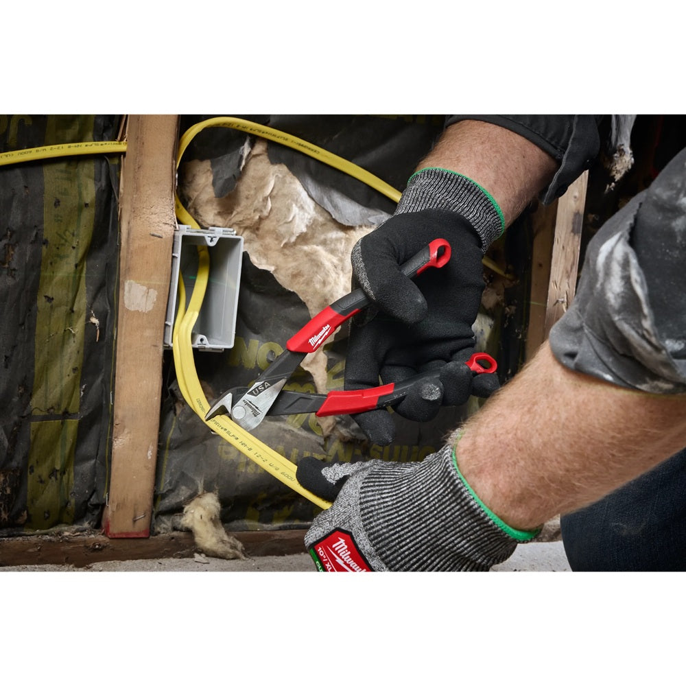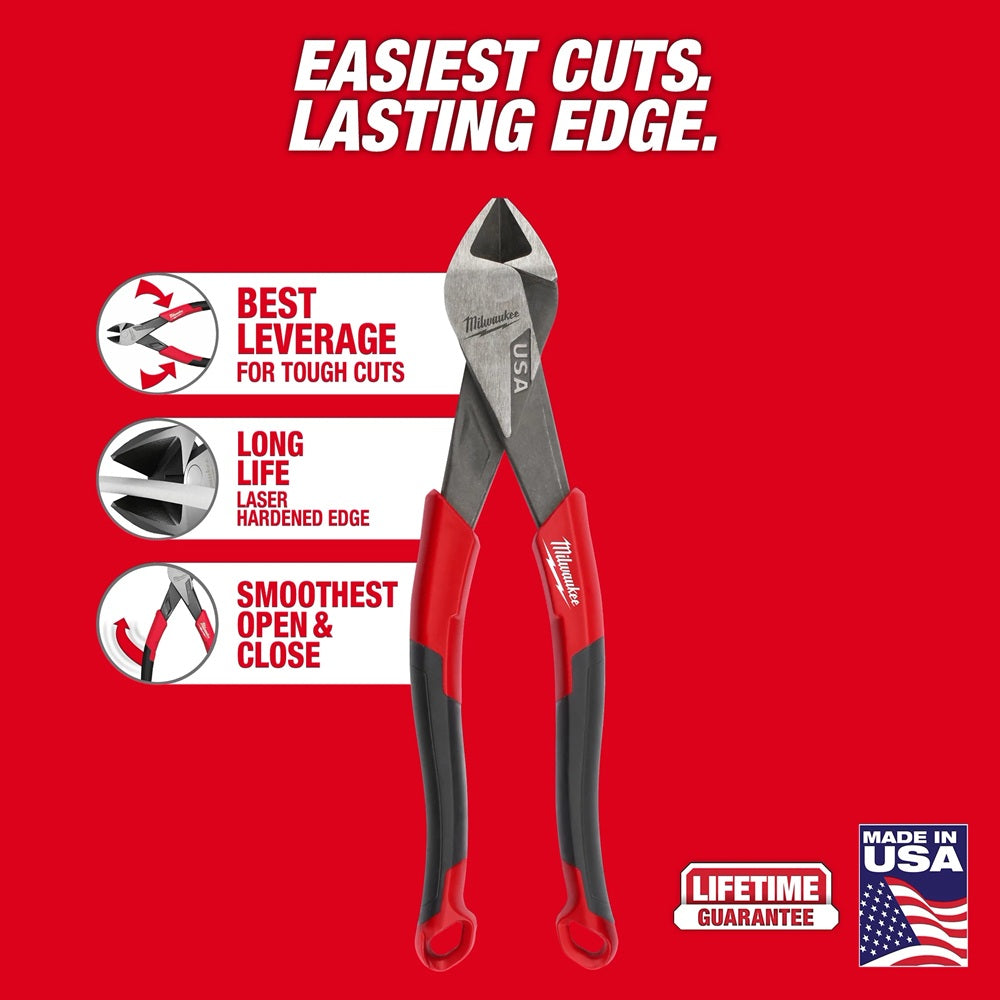 Our Diagonal Cutting Pliers (USA) deliver the easiest cuts and a lasting edge for the professional user. Our pliers are designed with an optimized pivot point to provide the best leverage for tough cuts through materials like wires, screws, and other standard hardware. Our diagonal cutting pliers deliver the confidence of an extended cut life with a laser-hardened edge. Our diagonal cutting pliers are engineered to provide the smoothest open and close experience from the start, with no break-in period required. The pliers are tether-ready and offered in both dipped grip with a split-ring hole and comfort grip with a lanyard hole. Our Diagonal Cutting Pliers are available in sizes of 6-inch, 7-inch, and 8-inch. The 8" Diagonal Pliers are also available as an Angled Head, aiding access, hand clearance, and prying. Our Milwaukee Diagonal Cutting Pliers are made in the USA with best-in-class manufacturing technology and USA-sourced materials, including durable, press-forged steel, and are backed by a complete Lifetime Guarantee.