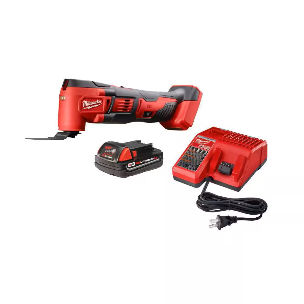 The MILWAUKEE M18 Cordless Multi-Tool cuts up to 50% faster and gives you up to 2X more cuts per charge than competitors. The oscillating multi-tool features best-in-class speed and performance and gives you the versatility to complete problematic job site applications. The cordless multi-tool is ideal for remodelers, flooring contractors, maintenance repair technicians, and electricians. The battery-powered multi-tool is powered by the M18 REDLITHIUM Battery giving you up to 40% more run-time. It gives you the power to grind, sand, and scrape at odd angles and in areas difficult to work. It also allows you to make flush or plunge cuts, remove grout in corners and tackle other awkward jobs. The tool's Constant Power Technology maintains blade speed for faster cutting during heavy applications. A 12-setting dial allows you to match the speed to the application. It includes 5 assorted sanding sheets, a sanding pad, and a wood cutting blade.