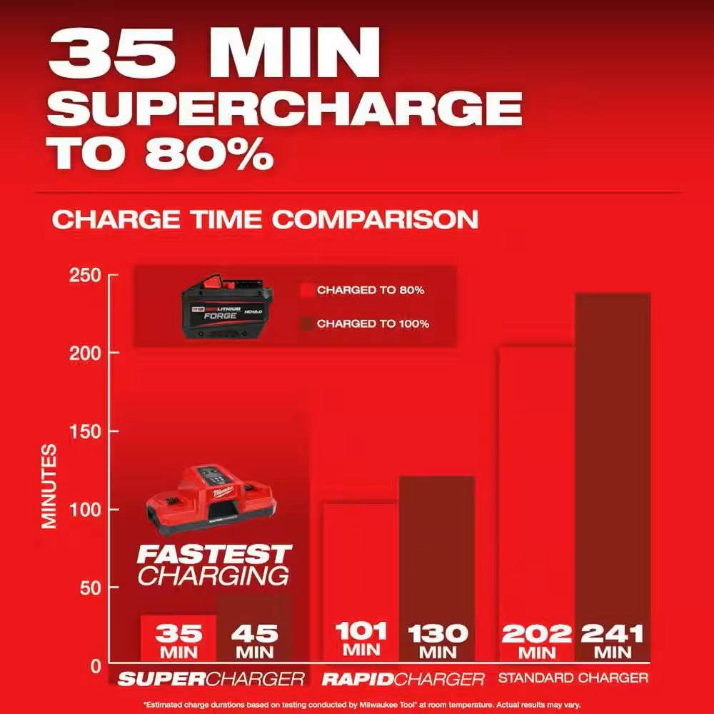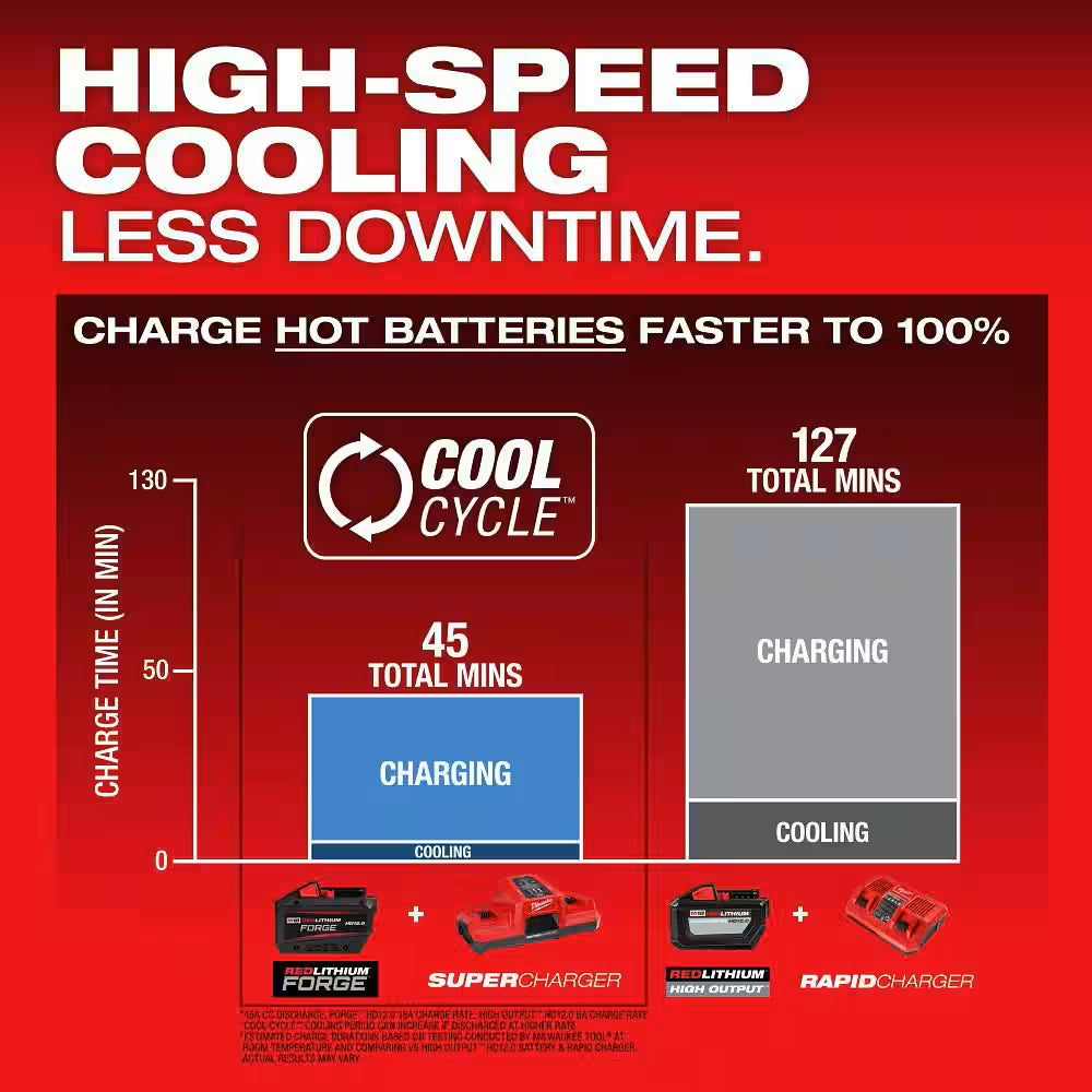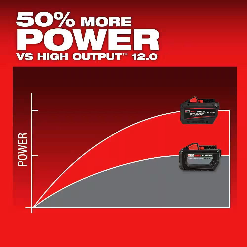 The MILWAUKEE M18 REDLITHIUM FORGE HD12.0 Battery Pack delivers 50% more power vs the HIGH OUTPUT 12.0, and the longest life vs REDLITHIUM batteries. REDLITHIUM FORGE are Milwaukee's most powerful, fastest charging, and longest life batteries. The M18 REDLITHIUM FORGE HD12.0 delivers 12 amp hours of runtime with 50% more power vs the HIGH OUTPUT 12.0, providing optimal power and runtime for demanding applications. This lithium-ion battery has the longest life, the most recharges, and the best performance over the life of the battery. It is also designed with resistant housing for increased protection against exposure to common oils, greases, and solvents. Built-in REDLINK Intelligence protects the battery from overloads, preventing you from damaging your cordless power tools in heavy-duty situations. The REDLITHIUM FORGE HD12.0 battery is fully compatible with 275+ M18 solutions. Our M18 & M12 Rapid Charger charges battery packs up to 40% faster, reducing your downtime and maximizing your productivity. The battery charger accepts all MILWAUKEE M18 and M12 batteries, providing a charging upgrade for both systems. The battery charger communicates directly with your battery pack to monitor cell voltage, temperature, and charge status to ensure a full charge.